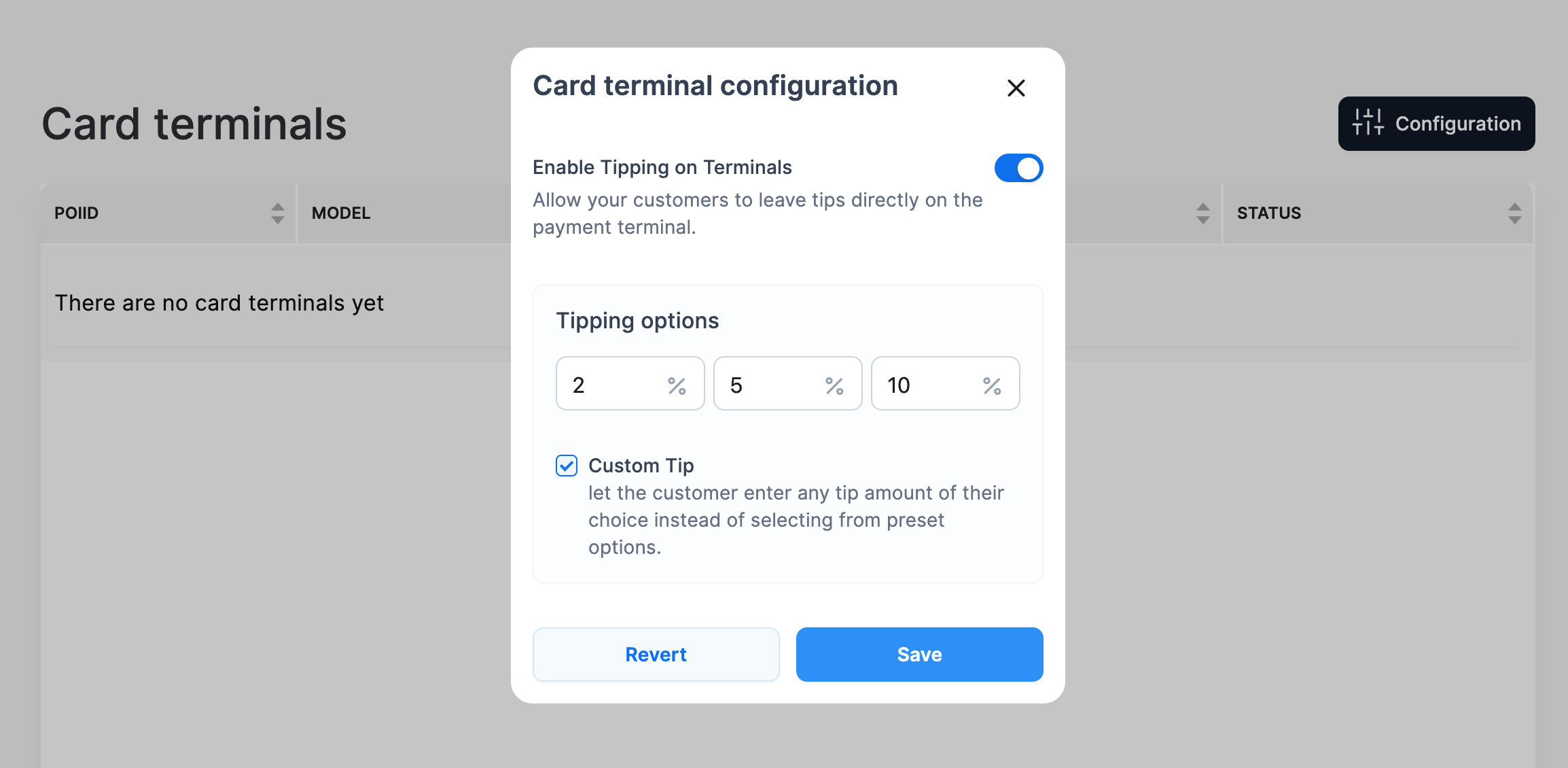 3. Once enabled, preconfigure the tipping options you want to display on the terminal. For example: 2%, 5%, and 10%.