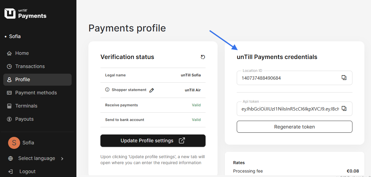 In order to retrieve the Location ID and API token, please go to your Payments profile in the unTill Payments portal and copy the credentials displayed in the unTill Payments credentials section.