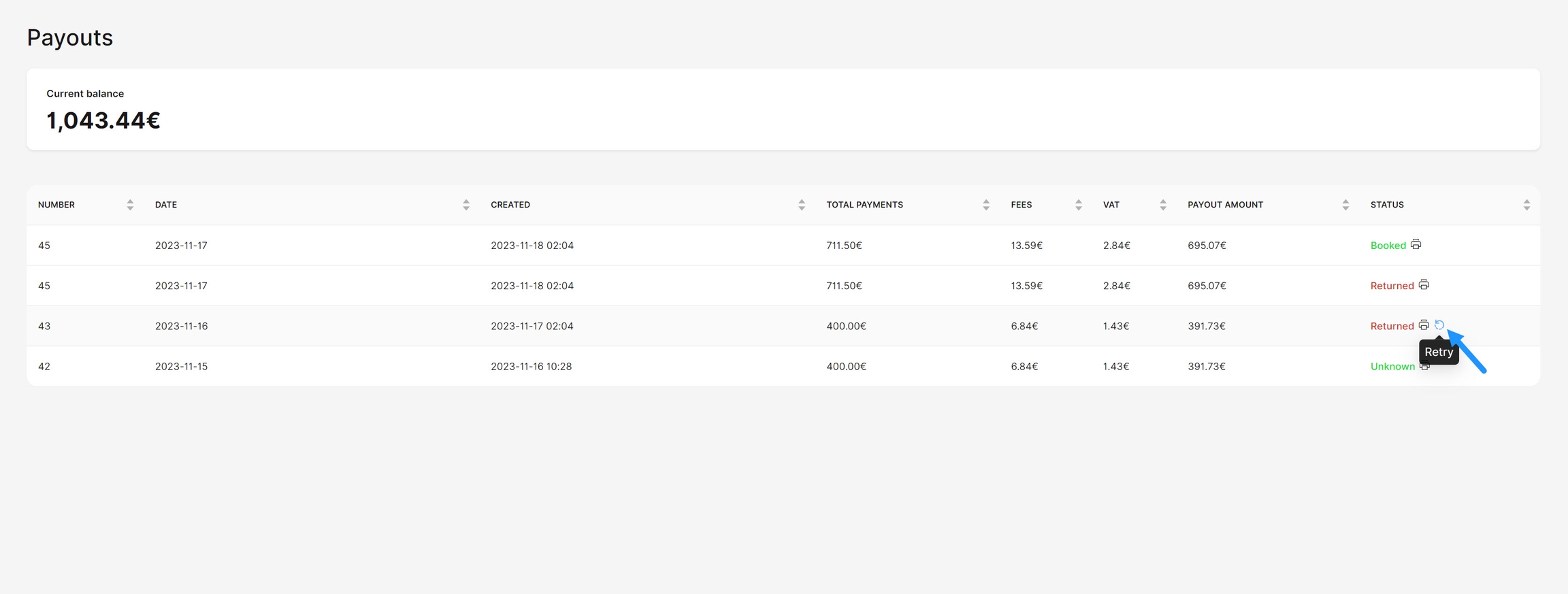 Klicken Sie auf das Symbol für die Wiederholung neben dem Status der Auszahlung.